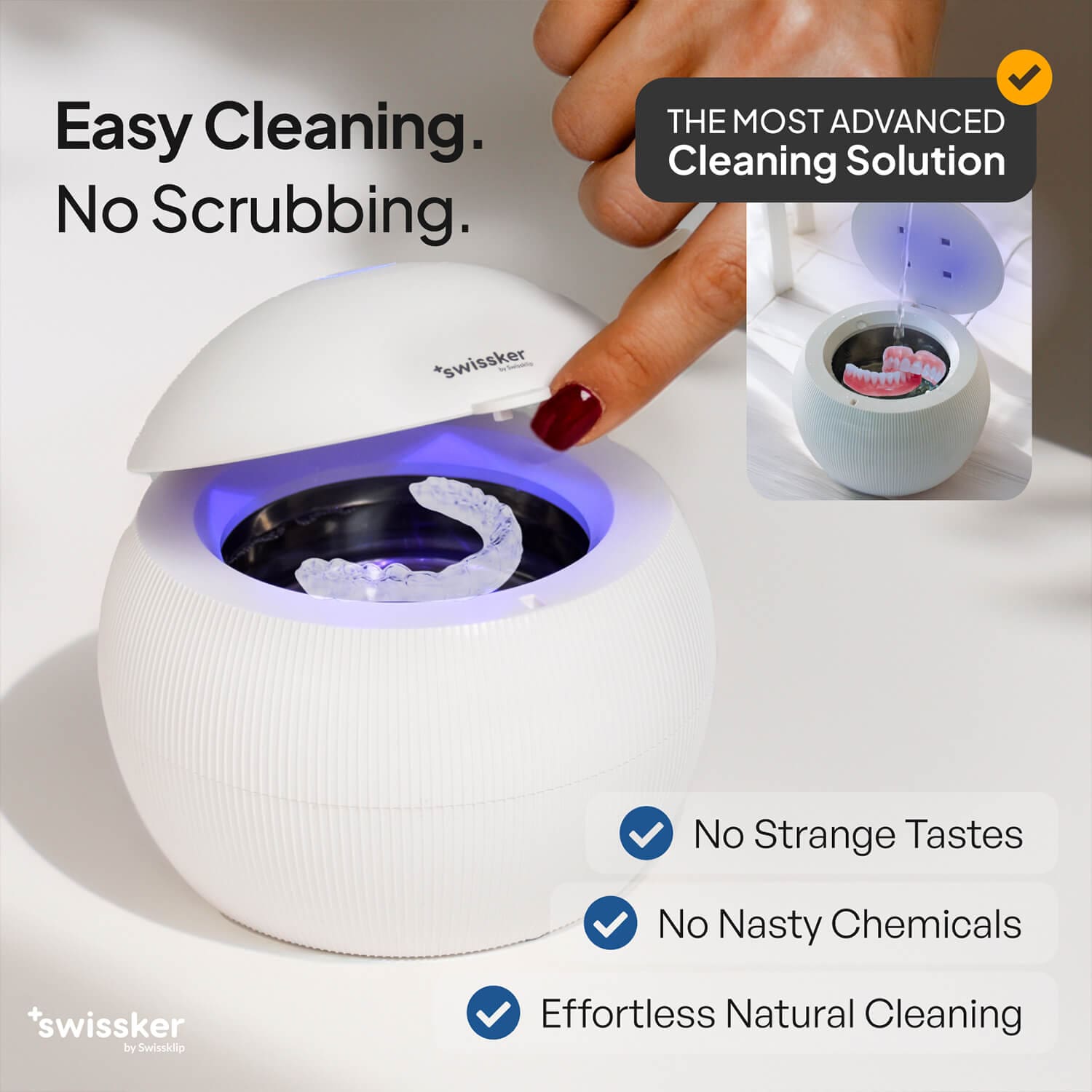 The UV light kills bad breath germs while the ultrasonic vibrations remove any gunk that may be stuck to your dentures, eliminating the need for scrubbing and brushing.