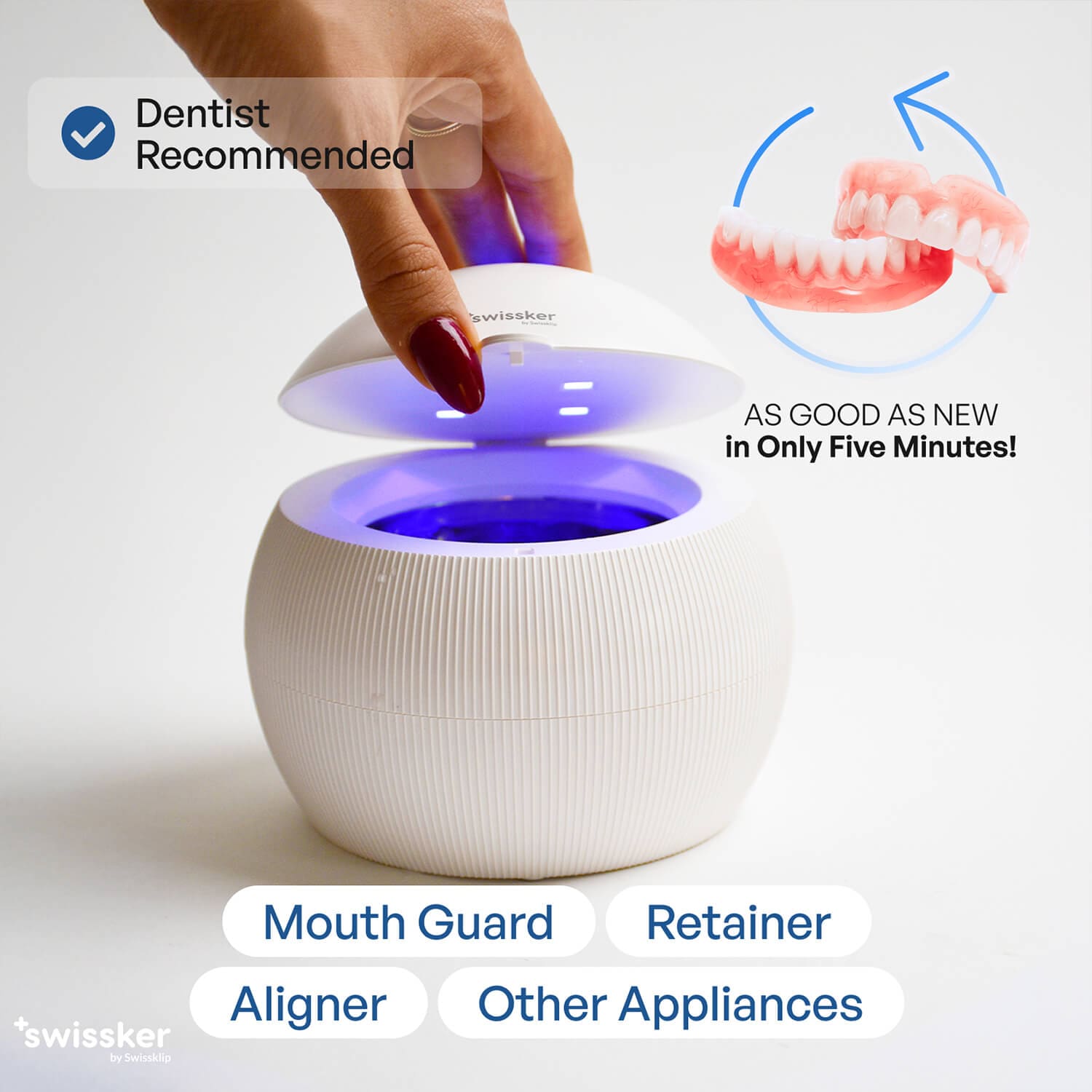 The ShinePod is an ultrasonic denture and retainer cleaner that uses UV light to kill bad breath germs. Also works as an effective mouth guard cleaner.
